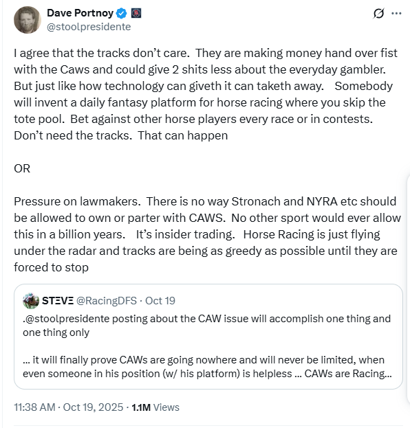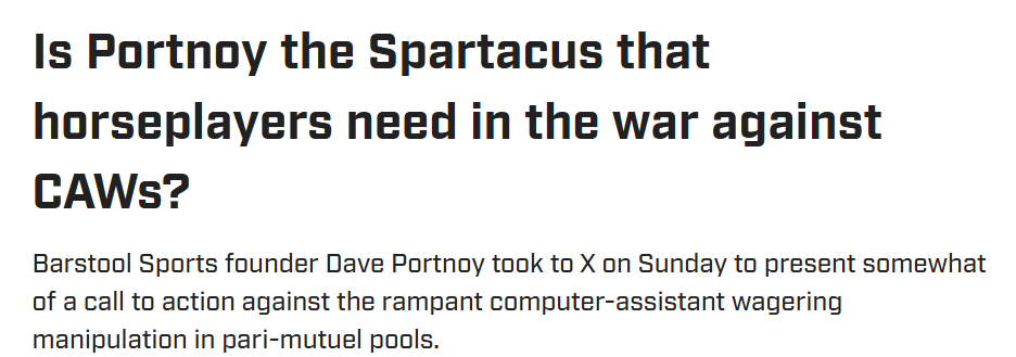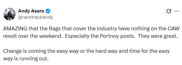 Andy is right. Even on Monday morning, the #2 story on X.com sports was Dave vs. CAWs. But in places that cover the industry daily - The Daily Racing Form, popular horse racing podcasts, racing websites - crickets. I’d guess for two reasons. 1. They get a lot of their ad revenue from racing and race tracks, and don’t want to risk that revenue by promoting Dave’s take on this. 2. They don’t like Dave and Barstool.