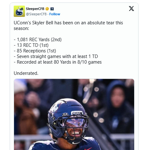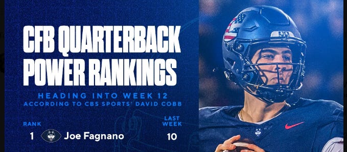 Fagnano is a terrific story. Played four years at Maine and yet somehow still has three years of eligibility for UConn. How is that possible? Again, I'm not a college football guy, so I have no clue. But his stat line this season is like something out of a video game.
