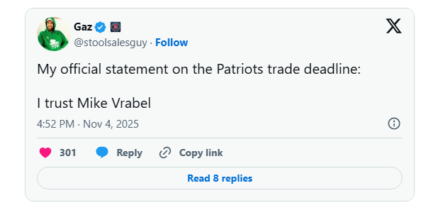 Patriots botch the trade deadline. Red Sox Offseason Season. Podcast News. NFL Picks. MutStack Notes. Don't be 'that guy'