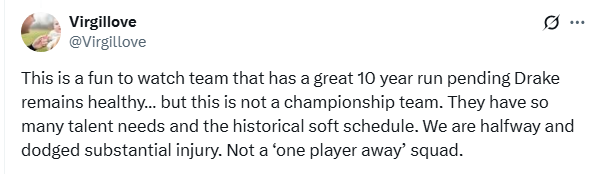 And in 2025, too many fans are stuck in Brady Land. This team has a unique opportunity THIS YEAR, not next year. Or 2027. They’re a quarterback injury away from being right back drafting in the Top 10.