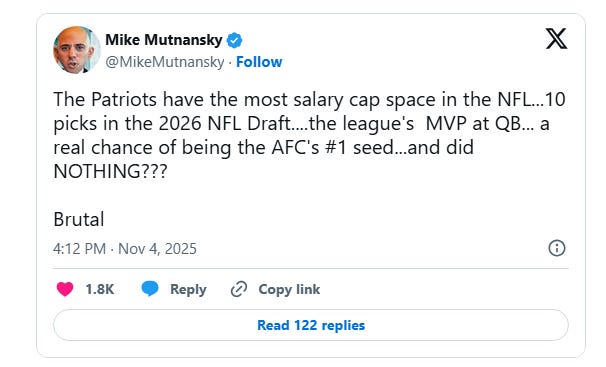 I mean…how do we know it isn’t? It’s an unfair comparison, but the 2001 Patriots were 5-4 through nine weeks of that season. Why not try to improve the team by making a few trades? You only get these chances so many times - look at the Washington Commanders this season.