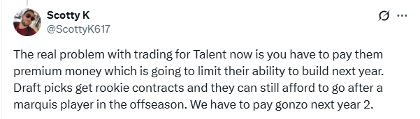 Or, you could have rented players for this season and let them walk. The team is not paying Drake Maye, Will Campbell, or Christian Gonzalez yet. Now would have been a good time to take on some additional salary. You also have the money to pay these rental players next season.