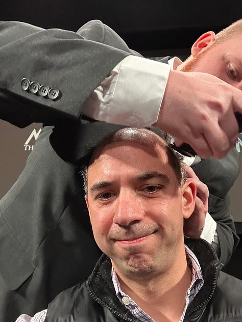 Back on stage later, again with no warning, and again I shake my head “no” to the idea of shaving my head.