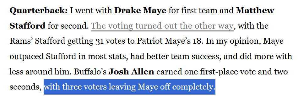 As I said, this should not bother me. I get stuff wrong all the time. But these ‘professionals’ watched football all season, and someone missed how much better Maye was than Allen. There are only 50 voters, so almost 10% of them blew this.