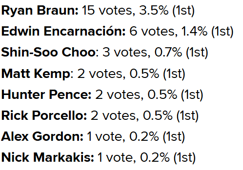But…Ryan Braun got 15 votes??? The same Ryan Braun who took PEDs, got caught, held a press conference where he basically accused the FedEx delivery guy who collected the sample of tampering with it in some bizarre rant about being framed? The same Bruan who, two years later, admitted he took PEDs and accepted a 65-game suspension from MLB? Manny Ramirez got caught juicing multiple times by MLB, and people still voted for him - they’re morons, too.
