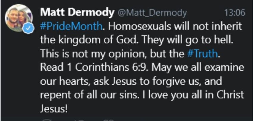 Pride Nights are about making sure LGBTQ+ people feel comfortable at the ballpark. It’s hard to imagine there are any LGBTQ+ Red Sox fans comfortable with cheering for Dermody, who’s said gay people are going to hell.