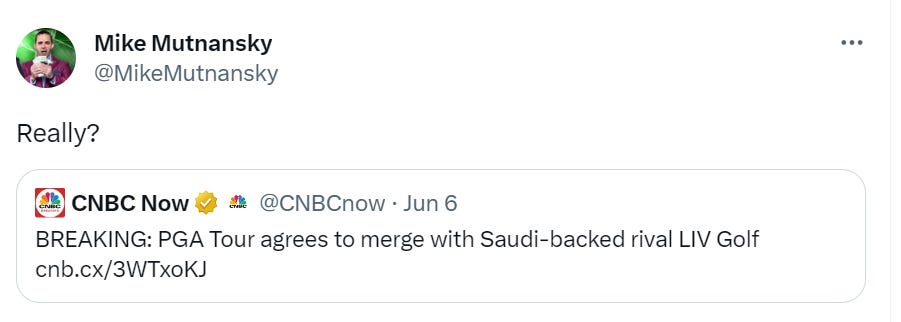 I’m convinced that one of the final things that led to this out-of-nowhere deal is the fact that some big-name golfer was close to a move to LIV. I thought that Tuesday. Apparently, so does golf insider Matt Adams.