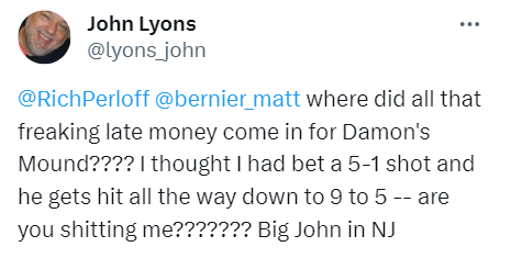 Two older gentlemen, probably late 50s or early 60s, were just beside themselves about how much late money Damon’s Mound took. And how much less their win payout was going to be.